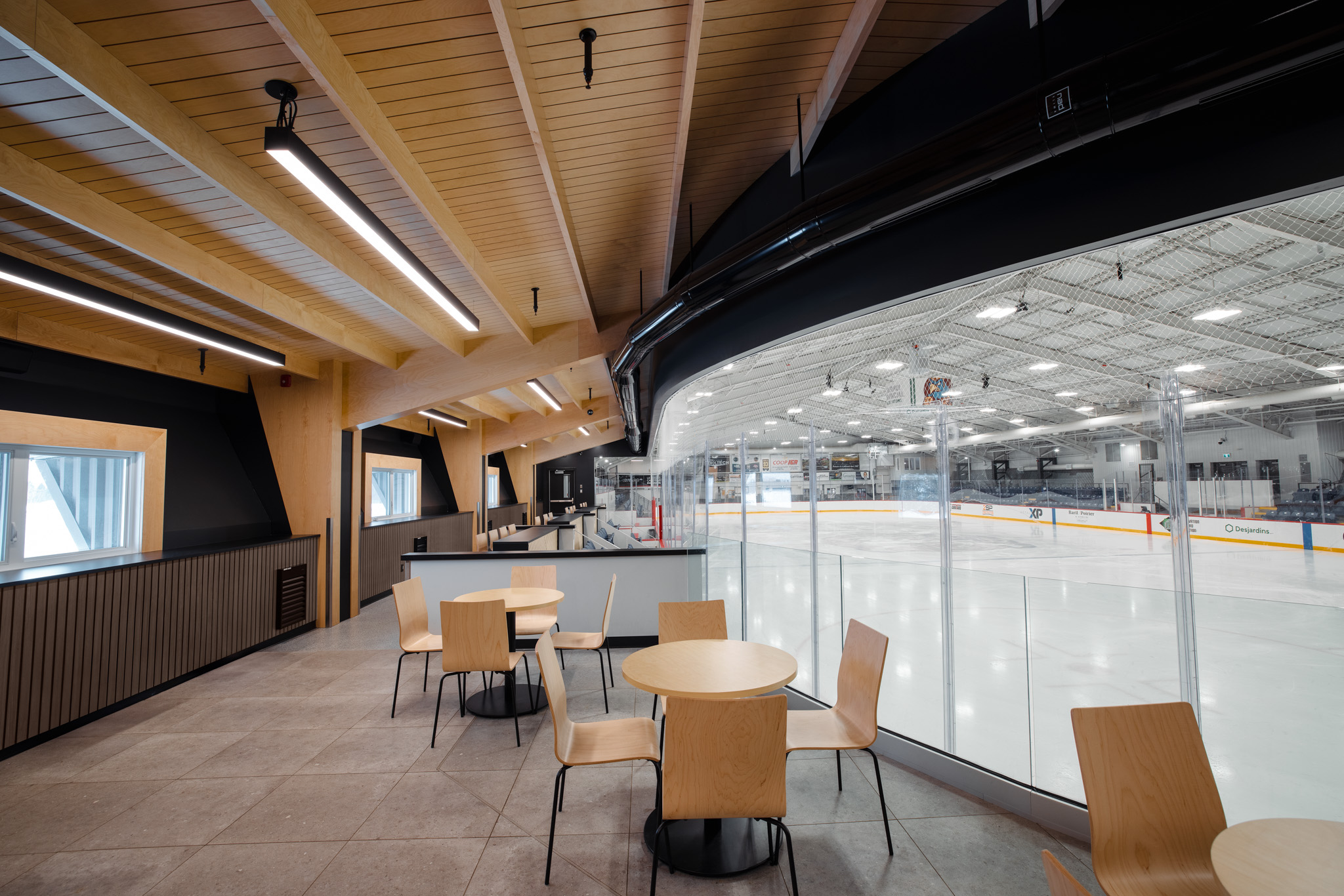 La complexité du projet est venue de la multifonctionnalité de la patinoire. En effet, la demande du client était que la surface de jeu devienne multifonctionnelle afin qu’elle puisse accueillir différents évènements, tel que des spectacles, ou encore d’autres évènements sportifs sans patinoire. Cette demande a donc impliqué l’installation d’un plancher amovible isolé, de rideaux au pourtour de la surface ainsi que le réarrangement des sorties d’urgence selon la configuration des différents types d’évènements. La multifonctionnalité des lieux a également engendré des enjeux sonores nécessitant l’ajout de panneaux acoustiques et la mise à niveau du système de sonorisation central.