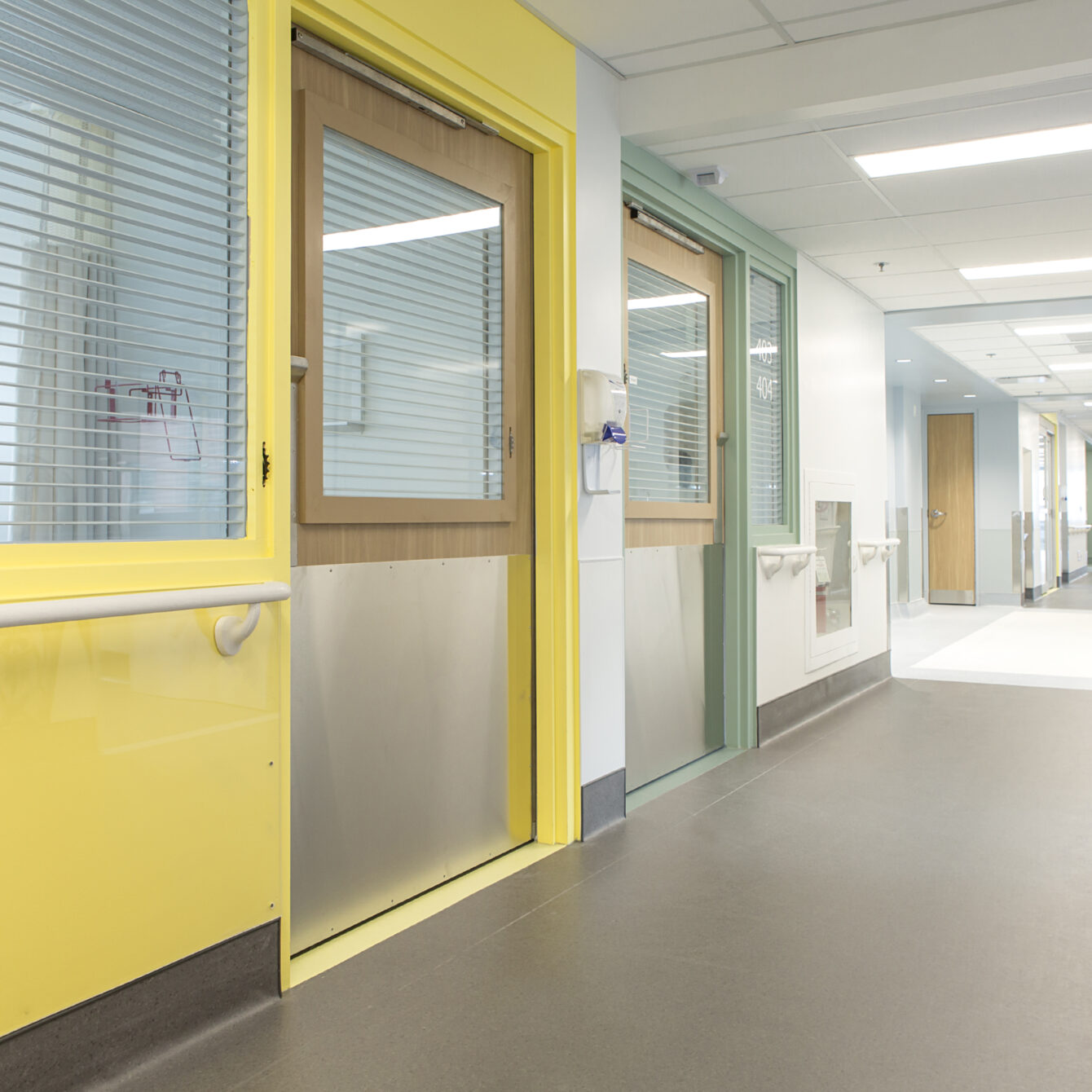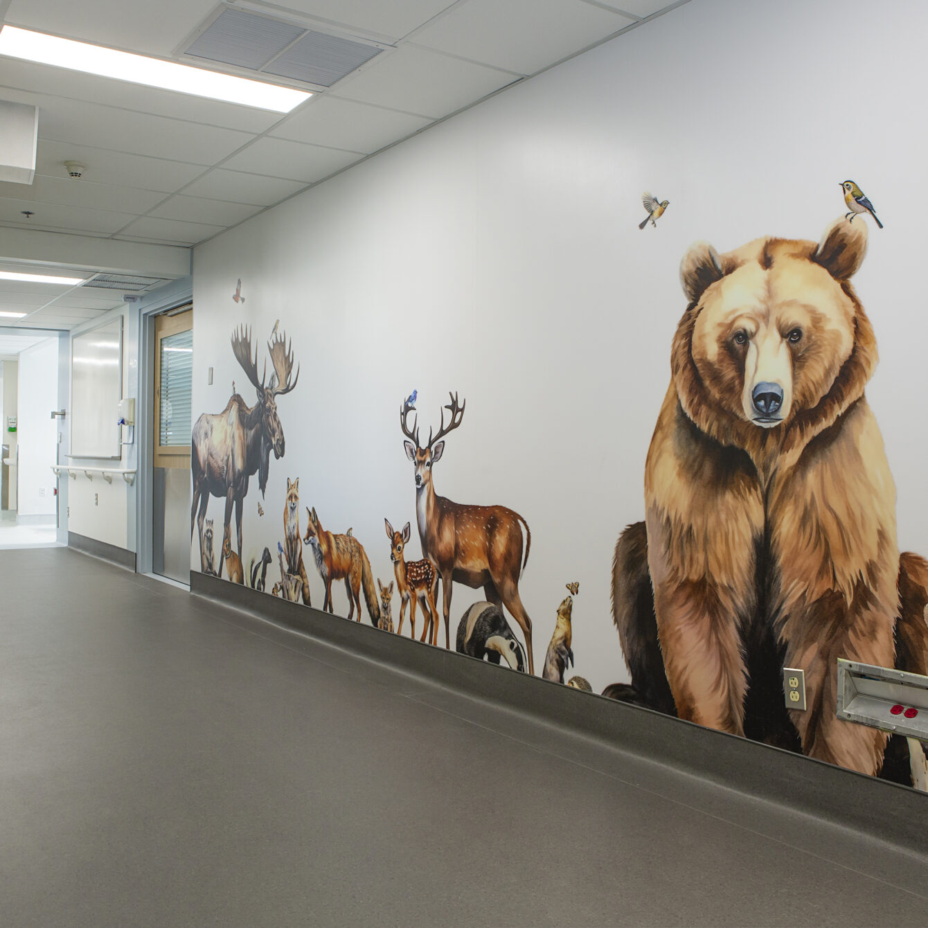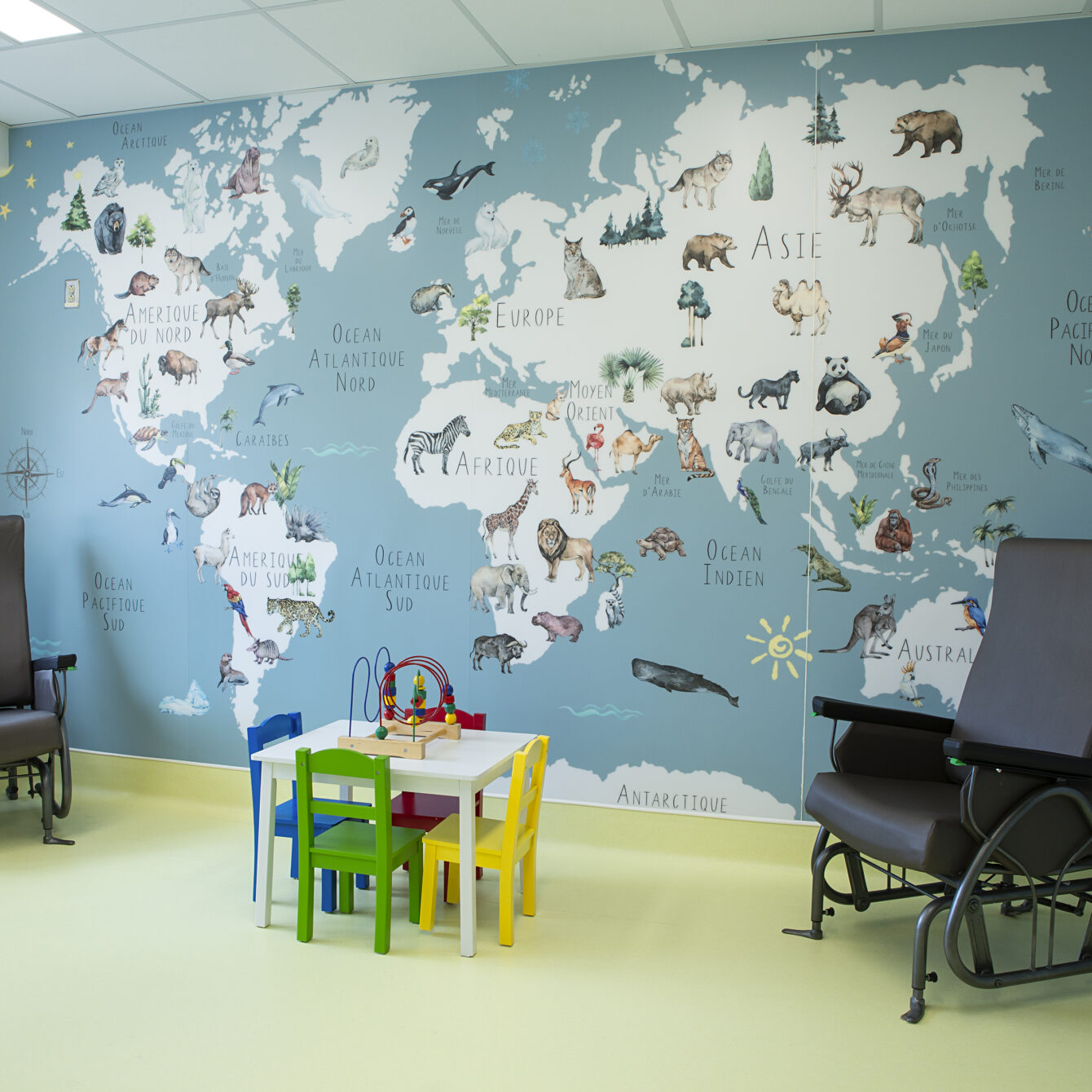 L’une des particularités de ce projet réside dans le soin apporté à la colorimétrie des espaces. Les aires pédiatriques de jour ont été aménagées dans des teintes jaunes et orangées, tandis que les chambres adoptent des nuances de vert et de bleu, en écho à l’imaginaire et à l’univers visuel des enfants. Une grande murale d’animaux anime également le corridor, contribuant à créer un environnement accueillant et ludique.