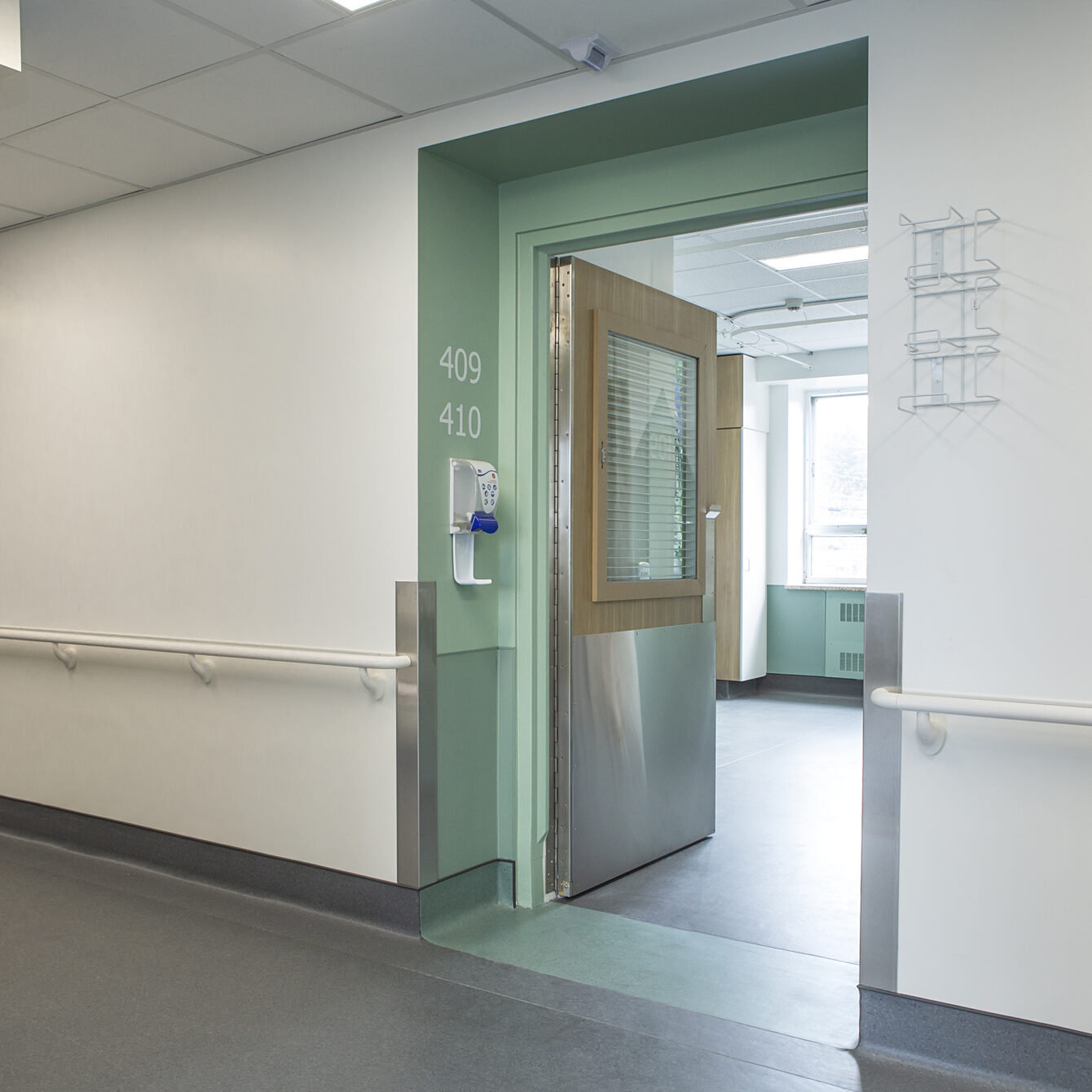 Par ailleurs, une attention particulière a été portée aux plafonds : des illustrations ludiques positionnées au-dessus des lits offrent un cadre apaisant et divertissant pour les jeunes patients durant les moments d’occultation.
